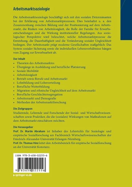 Die Herausgeber Prof. Dr. Martin Abraham ist Inhaber des Lehrstuhls für Soziologie und empirische Sozialforschung am Fachbereich Wirtschaftswissenschaften der Friedrich-Alexander-Universität Erlangen-Nürnberg. Prof. Dr. Thomas Hinz leitet den Arbeitsbereich für empirische Sozialforschung an der Universität Konstanz.