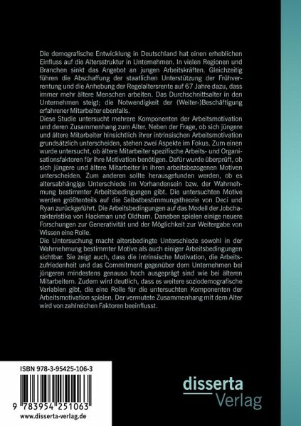 Diese Studie untersucht mehrereKomponenten der Arbeitsmotivation und deren Zusammenhang zum Alter. Neben der Frage, ob sich jüngere und ältere Mitarbeiter hinsichtlich ihrer intrinsischen Arbeitsmotivation grundsätzlich unterscheiden, stehen zwei Aspekte im Fokus. Zum einen wurde untersucht, ob ältere Mitarbeiter spezifische Arbeits- und Organisationsfaktoren für ihre Motivation benötigen. Dafür wurde überprüft, ob sich jüngere und ältere Mitarbeiter in ihren arbeitsbezogenen Motiven unterscheiden. Zum anderen sollte herausgefunden werden, ob es altersabhängige Unterschiede im Vorhandensein bzw. der Wahrnehmung bestimmter Arbeitsbedingungen gibt.