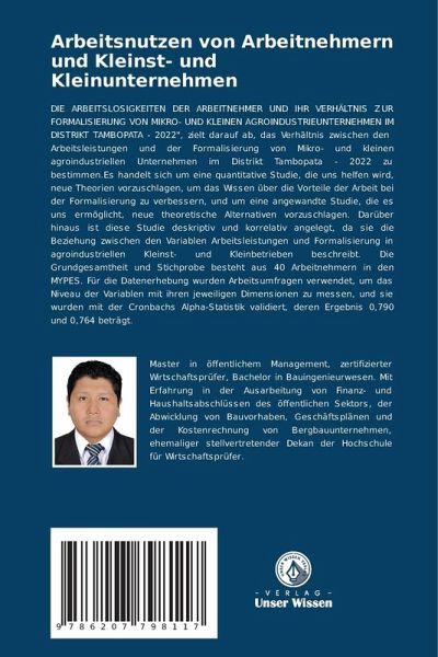 DIE ARBEITSLOSIGKEITEN DER ARBEITNEHMER UND IHR VERHÄLTNIS ZUR FORMALISIERUNG VON MIKRO- UND KLEINEN AGROINDUSTRIEUNTERNEHMEN IM DISTRIKT TAMBOPATA - 2022", zielt darauf ab, das Verhältnis zwischen den Arbeitsleistungen und der Formalisierung von Mikro- und kleinen agroindustriellen Unternehmen im Distrikt Tambopata - 2022 zu bestimmen.Es handelt sich um eine quantitative Studie, die uns helfen wird, neue Theorien vorzuschlagen, um das Wissen über die Vorteile der Arbeit bei der Formalisierung zu verbessern, und um eine angewandte Studie, die es uns ermöglicht, neue theoretische Alternativen vorzuschlagen. Darüber hinaus ist diese Studie deskriptiv und korrelativ angelegt, da sie die Beziehung zwischen den Variablen Arbeitsleistungen und Formalisierung in agroindustriellen Kleinst- und Kleinbetrieben beschreibt. Die Grundgesamtheit und Stichprobe besteht aus 40 Arbeitnehmern in den MYPES. Für die Datenerhebung wurden Arbeitsumfragen verwendet, um das Niveau der Variablen mit ihren jeweiligen Dimensionen zu messen, und sie wurden mit der Cronbachs Alpha-Statistik validiert, deren Ergebnis 0,790 und 0,764 beträgt.