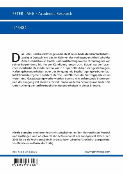 Das Hotel- und Gaststättengewerbe stellt einen bedeutenden Wirtschaftszweig in Deutschland dar. Im Rahmen der vorliegenden Arbeit wird das Arbeitsverhältnis im Hotel- und Gaststättengewerbe chronologisch von seiner Begründung bis hin zur Kündigung untersucht. Dabei werden branchenspezifische Besonderheiten wie z.B. spezielle Arbeitszeitgestaltungen, Haftungsbesonderheiten oder der Umgang mit Beschäftigungsverboten laut Infektionsschutzgesetz erörtert. Rechte und Pflichten der Vertragsparteien im Hotel- und Gaststättengewerbe werden ebenso wie auftretende Störungen und der Umgang mit diesen erörtert. Einen weiteren Schwerpunkt bildet die Untersuchung der tarifvertraglichen Besonderheiten in dieser Branche.