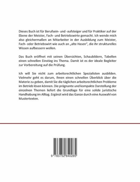 Dieses Buch ist für Berufsein- und -aufsteiger und für Praktiker auf der Ebene der Meister, Fach- und Betriebswirte gemacht. Ich wende mich also gleichermaßen an Mitarbeiter in der Ausbildung zum Meister, Fach- oder Betriebswirt wie auch an "alte Hasen", die ihr strukturelles Wissen aufbessern wollen.Das Buch eröffnet mit seinen Übersichten, Schaubildern, Tabellen einen schnellen Einstieg ins Thema. Damit ist es der ideale Begleiter zur Vorbereitung auf die Prüfung. Ich will Sie nicht zum arbeitsrechtlichen Spezialisten ausbilden. Vielmehr geht es darum, Ihnen einen schnellen Überblick über die Materie zu geben, damit Sie die täglichen arbeitsrechtlichen Probleme im Betrieb lösen können. Die prägnante und kompakte Darstellung der einzelnen Themen liefert die Grundlage für eine solide juristische Handhabung im Alltag. Ergänzt wird das Ganze durch eine Auswahl von Mustertexten.
