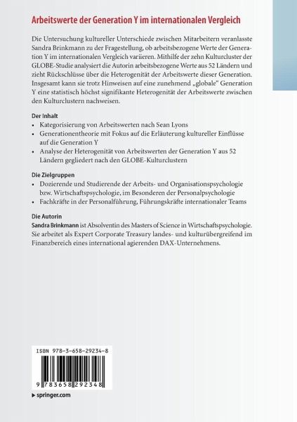 Die Untersuchung kultureller Unterschiede zwischen Mitarbeitern veranlasste Sandra Brinkmann zu der Fragestellung, ob arbeitsbezogene Werte der Generation Y im internationalen Vergleich variieren. Mithilfe der zehn Kulturcluster der GLOBE-Studie analysiert die Autorin arbeitsbezogene Werte aus 52 Ländern und zieht Rückschlüsse über die Heterogenität der Arbeitswerte dieser Generation. Insgesamt kann sie trotz Hinweisen auf eine zunehmend "globale" Generation Y eine statistisch höchst signifikante Heterogenität der Arbeitswerte zwischen den Kulturclustern nachweisen.