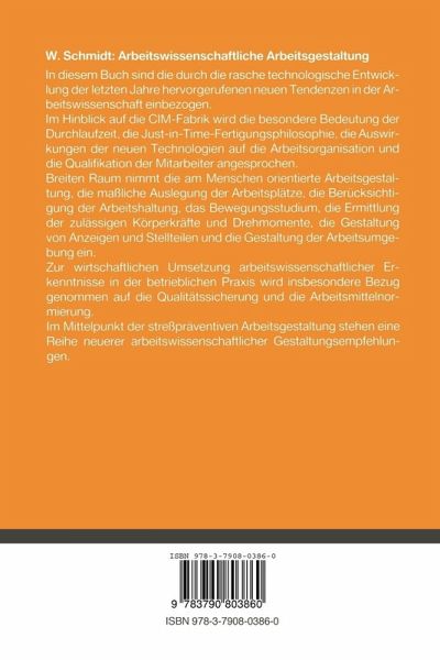 1. Arbeitsgestaltung - Neue Tendenzen.- 1.1 Bedingungen neuer Arbeitsstrukturen.- 1.2 Zukunftsperspektiven - CIM-Fabrik.- 1.3 Flexible Fertigungssysteme.- 1.4 Die Bedeutung der Durchlaufzeit.- 1.5 Just-in-Time-Fertigungsphilosophie.- 1.6 Auswirkungen neuer Technologien auf die Arbeitsorganisation.- 1.7 Neue Technologien - neue Qualifikationen.- 2. Fliessarbeit und Montage auf dem Wege zur Automatisierung.- 2.1 Verminderung von Handhabungsoperationen.- 2.2 Abtaktung von Montagesystemen.- 3. Grundlagen Ergonomischer Arbeitsgestaltung.- 3.1 Anthropometrische Arbeitsgestaltung.- 3.2 Arbeitshaltungen.- 3.3 Bewegungsstudium, Bewegungsabläufe.- 3.4 Körperkräfte und Drehmomente.- 3.5 Stellteile, Bedienelemente.- 3.6 Optische Anzeigen.- 4. Ergonomische Gestaltung der Arbeitsumgebung.- 4.1 Beleuchtung.- 4.2 Lärm.- 4.3 Klima.- 4.4 Mechanische Schwingungen.- 5. Qualitätssicherung Durch Fehlerprophylaxe in der Fertigung Mittels Qualitäts-Check-Listen.- 5.1 Qualität, Gebrauchstauglichkeit, Fehler und Mängel.- 5.2 Maßnahmen der Qualitätsförderung.- 5.3 Qualitäts-Check-Listen.- 6. Arbeitsmittelnormierung.- 6.1 Normierung.- 6.2 Gliederung technischer Arbeitsmittel.- 6.3 Bewertungsmatrix.- 6.4 Vorgehensweise bei der Normierung von Arbeitsmitteln.- 6.5 Zukunftsorientierte, rechnergestützte Arbeitsplatzgestaltung mittels Arbeitsmittelnormierung.- 7. Stresspräventive Arbeitsgestaltung.- 7.1 Streßdef initionen.- 7.2 Streßverursachende Faktoren.- 7.3 Langzeitstreßreaktion: Reduzierte Belastbarkeit.- 7.4 Streßprävention durch Arbeitsgestaltung.- Sachwortverzeichnis.