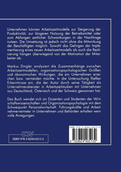 Unternehmen können Arbeitszeitmodelle zur Steigerung der Produktivität, zur längeren Nutzung der Betriebsmittel oder zum Abfangen zeitlicher Schwankungen in der Nachfrage nutzen. Die Umsetzung ist jedoch nicht ohne die Mitwirkung der Beschäftigten möglich. Sowohl das Gelingen der Implementierung eines neuen Arbeitszeitmodells als auch die Realisierung hängen überwiegend von der Motivation der Mitarbeiter ab. Markus Dingler analysiert die Zusammenhänge zwischen Arbeitszeitmodellen, organisationspsychologischen Größen und ökonomischen Wirkungen, die ein Unternehmen erreichen bzw. vermeiden möchte. In die Untersuchung fließen Erkenntnisse ein, die der Autor durch seine Tätigkeit als Unternehmensberater in Arbeitszeitstudien mit Unternehmen aus Deutschland, Österreich und der Schweiz gewonnen hat.