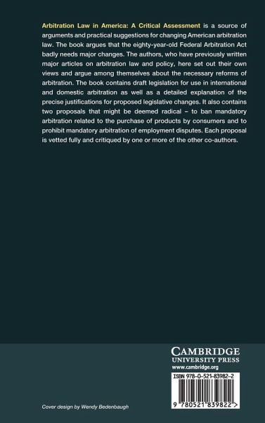 Arbitration Law in America: A Critical Assessment is a source of arguments and practical suggestions for changing the American arbitration process. The book argues that the Federal Arbitration Act badly needs major changes. The authors, who have previously written major articles on arbitration law and policy, here set out their own views and argue among themselves about the necessary reforms of arbitration. The book contains draft legislation for use in international and domestic arbitration and a detailed explanation of the precise justifications for proposed legislative changes. It also contains two proposals that might be deemed radical - to ban arbitration related to the purchase of products by consumers and to prohibit arbitration of employment disputes. Each proposal is vetted fully and critiqued by one or more of the other co-authors.