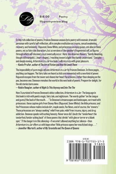 Arboretum in a Jar uses personae to evoke the fractured self that results from a traumatic childhood. The poet revisits stories and fairy tales, invigorating and reframing them in ways that transcend the traditional passive nature of their heroines. She challenges the tropes of childhood, innocence, and femininity.