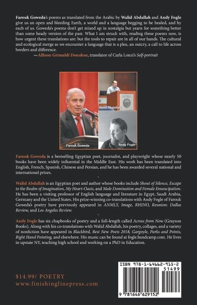 Farouk Goweda's poems as translated from the Arabic by Walid Abdallah and Andy Fogle give us an open and bleeding Earth, a world and a language begging to be healed, and by each of us. Goweda's poems don't get mixed up in nostalgia but yearn for something better than some heady version of the past. What I am struck with, reading these poems now, is how urgent these translations are: but the tools to repair are in all of our hands. The cultural and ecological merge as we encounter a language that is a plea, an outcry, a call to life across borders and difference.-Allison Grimaldi Donahue, translator of Carla Lonzi's Self-portrait