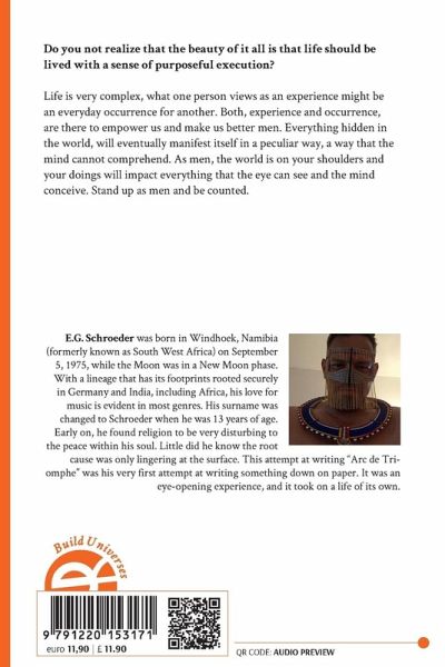 Do you not realize that the beauty of it all is that life should be lived with a sense of purposeful execution? Life is very complex, what one person views as an experience might be an everyday occurrence for another. Both, experience and occurrence, are there to empower us and make us better men. Everything hidden in the world, will eventually manifest itself in a peculiar way, a way that the mind cannot comprehend. As men, the world is on your shoulders and your doings will impact everything that the eye can see and the mind conceive. Stand up as men and be counted. E.G. Schroeder was born in Windhoek, Namibia (formerly known as South West Africa) on September 5, 1975, while the Moon was in a New Moon phase. With a lineage that has its footprints rooted securely in Germany and India, including Africa, his love for music is evident in most genres. His surname was changed to Schroeder when he was 13 years of age. Early on, he found religion to be very disturbing to the peace within his soul. Little did he know the root cause was only lingering at the surface. This attempt at writing Arc de Triomphe was his very first attempt at writing something down on paper. It was an eye-opening experience, and it took on a life of its own.