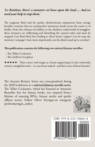 'Le Bateleur, there's a monsters set loose upon the end ... And we need your help.' The magician Batel and his quirky and dysfunctional companions hunt strange heraldic creatures that are rearing their monstrous heads all across the country of Etellia. From the richness of nobility to the shadowy underworld of smugglers, these monsters are inflitrating and disturbing the natural order and must be stopped. Can Batel find clues leading to these beasts' origins? Can Batel stop the monster's rampage? And, more importantly, can his ideals stand up to scrunity? This publication contains the following two satricial fantasy novellas:The Tellier Cockatrice The Gulliver's Gryphon The Arcana's Bestiary Series was conceptualised during the 2020 Lockdowns as a satricial fantasy novella series. The Tellier Cockatrice, which has featured in Amazon's Bestseller lists for fantasy books, was inspired from a lifetime of enjoying RPGs, fantasy media and quirky offbeat stories.
