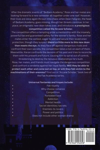 After the dramatic events of "Bedlam Academy," Rose and her mates are looking forward to a new semester all together under one roof. However, their lives are once again thrown into chaos when Dean Fallgren, the head of Bedlam Academy, goes missing, though her threats continue. In her place, an enigmatic new dean takes over, and introduces a prestigious competition called the Arcane Scholar. The competition offers a tempting prize: a mentorship with the insanely powerful fae and guaranteed safety for the winner's family. Rose and her mates enter the contest, eager to win and secure their loved ones' protection, though they suspect there's a little more to this new dean than meets the eye. As they face off against dangerous rivals and confront their own secrets, the competition takes a toll on each of them. Meanwhile, Kieran confronts the demons of his past and tries to reconcile them with his present and future, causing him to spiral out of control, threatening to destroy the tenuous relationships he's built. Rose, her mates, and friends must navigate the dangerous competition and confront a vendetta against her royal family. Will they be able to protect each other and come out on top, or will they fall victim to the machinations of their enemies? Find out in "Arcane Scholar," book two of the Fae Academia series. Universal fantasies and tropes include:Fae royalty Why choose romance Competition Forbidden love Addiction Mental health Secret identities/secrets Enemies-to-lovers Power and politics Does not include other woman drama