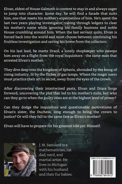 Elvan, eldest of House Galmoth, is content to stay in and always eager to jump into character. Someday, he will find a facade that suits him, one that meets his mother's expectations of him. He's spent the last two years playing investigator, raking through ledgers to clear his mother's name while ignoring his family business and noble House crumbling around him. When the last servant quits, Elvan is forced back into the world and must choose between continuing his fruitless investigation and saving his home from the collectors. On his last lead, he meets Drace, a lonely shopkeeper who sweeps him away on a flight from the royal inquisitors, who is the same man that arrested Elvan's mother. They dive deep into the kingdom of Spheris, shrouded by the smog of rising industry, lit by the flicker of gas lamps. Here, the magic users must practice their art in secret, away from the eyes of the crown. After discovering their intertwined pasts, Elvan and Drace forge forward, uncovering the plot that led to his mother's exile, but who can they go to when the guilty ones are at the highest level of power? Can they dodge the inquisitors and questionable motivations of Elvan's sister, the Duchess, long enough to bring the crown to justice? Or will they fall to the same fate as Elvan's mother? Elvan will have to prepare for his greatest role yet: Himself.