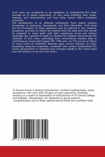 Arch wires are considered to be backbone of orthodontics.This book provides an in depth exploration of arch wires including their shape, material, and characteristics and how these factors affect treatment outcomes.The development of an effective orthodontic force system requires knowledge of mechanics, biomaterials, and their interaction. Arch wires are the foundation of these appliances and are selected in size, material, properties, and bent to deliver the desired force.The ideal arch wire should be designed to move teeth with light continuous forces and behave elastically over a period of weeks to months.The chapters demonstrate the evolution of arch wires technology from conventional stainless steel to contemporary choices like-Copper NiTi, TMA wire, etc.The success or failure of many forms of treatment depends upon correct selection of wires, possessing adequate properties, combined with careful manipulation.The recent advancement in materials have changed rapidly in the recent years and will continue to do so in the future.