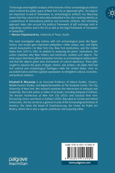 This book investigates why nations with rich archaeological pasts like Egypt, Greece, and Jordan gave important antiquities-often unique, rare, and highly valued monuments-to New York City, New York Institutions, and the United States from 1879 to 1965. In addition to analyzing the givers' motivations, the author examines why New Yorkers and Americans coveted such objects. The book argues that these gifted antiquities function as archaeological ambassadors and that the objects given were instruments of cultural diplomacy. These gifts sought to advance the goals of Egypt, Greece, and Jordan-all states that had rich cultural and archaeological heritages-with the United States, once an ascendent nation and then a global superpower, to strengthen cultural, economic, and political relations.