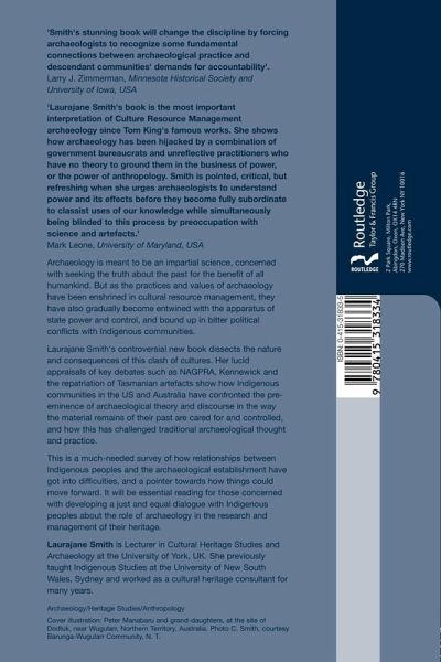 This controversial book is a survey of how relationships between indigenous peoples and the archaeological establishment have got into difficulty, and a crucial pointer to how to move forward from this point. With lucid appraisals of key debates such as NAGPRA, Kennewick and the repatriation of Tasmanian artefacts, Laurajane Smith dissects the nature and consequences of this clash of cultures. Smith explores how indigenous communities in the USA and Australia have confronted the pre-eminence of archaeological theory and discourse in the way the material remains of their past are cared for and controlled, and how this has challenged traditional archaeological thought and practice. Essential reading for all those concerned with developing a just and equal dialogue between the two parties, and the role of archaeology in the research and management of their heritage.