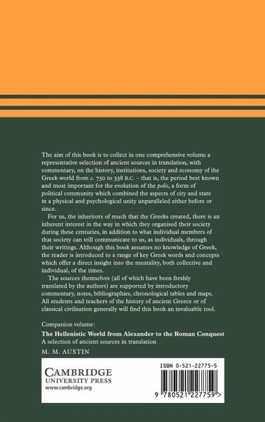 List of figures List of maps Preface Conventions and abbreviations Glossary Weights, measures, money Introduction I: Greek society Introduction II: the sources Part I. The Archaic Period: 1. The development of the polis and its values 2. Exploration and colonisation 3. Tyranny 4. The institutions of the polis 5. Sparta 6. Athens 7. Kleisthenes and the d¿mos 8. Diversity and unity 9. The Persian Empire 10. Persia and the Greeks Part II. The Fifth Century: 11. The development of Athenian democracy 12. The Athenian Empire 13. Athenian political life 14. The culture of Athens 15. Economic and social developments in Athens 16. Athens and Sparta in the Pentekontaëtia 17. The prelude to the Peloponnesian War Part III. The Peloponnesian War: 18. Spartan strategy in the Archidamian War 19. Athenian strategy in the Archidamian War 20. The uneasy peace, 421-416 21. Athenian politics during the war 22. Athens and Sicily 23. The Spartan offensive 24. The defeat of Athens 25. Post-war Athens, 404-399 Part IV. The Fourth Century: 26. Spartan imperialism 27. The resurgence of Athens 28. Sparta, Athens and Thebes 29. The polis and its economy 30. War and revolution 31. Athenian politics and society 32. Thessaly and Persia 33. The rise of Makedonia 34. Philippos and Greece Chronological table Table of rulers Index of ancient sources Index of Greek words Index of names Index of subjects.