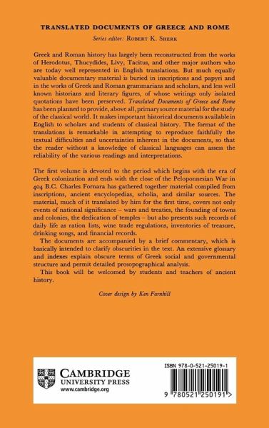 The first volume is devoted to the period which begins with the era of Greek colonization and ends with the close of the Peloponnesian War in 404 B. C. Charles Fornara has gathered together material compiled from inscriptions, ancient encyclopedias, scholia, and similar sources. The material, much of it translated by him for the first time, covers not only events of national significance - wars and treaties, the founding of towns and colonies, the dedication of temples - but also presents such records of daily life as ration lists, wine trade regulations, inventories of treasure, drinking songs, and financial records. The documents are accompanied by a brief commentary, which is basically intended to clarify obscurities in the text. An extensive glossary and indexes explain obscure terms of Greek social and governmental structure and permit detailed prosopographical analysis. This 1983 book will be welcomed by students and teachers of ancient history.