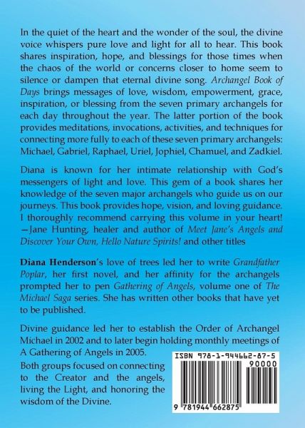 In the quiet of the heart and the wonder of the soul, the divine voice whispers pure love and light for all to hear. This book shares inspiration, hope, and blessings for those times when the chaos of the world or concerns closer to home seem to silence or dampen that eternal divine song. Archangel Book of Days brings messages of love, wisdom, empowerment, grace, inspiration, or blessing from the seven primary archangels for each day throughout the year. The latter portion of the book provides meditations, invocations, activities, and techniques for connecting more fully to each of these seven primary archangels: Michael, Gabriel, Raphael, Uriel, Jophiel, Chamuel, and Zadkiel.