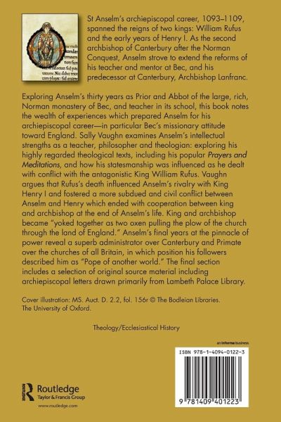 St Anselm's archiepiscopal career, 1093-1109, spanned the reigns of two kings: William Rufus and the early years of Henry I. As the second archbishop of Canterbury after the Norman Conquest, Anselm strove to extend the reforms of his teacher and mentor at Bec, and his predecessor at Canterbury, Archbishop Lanfranc. Exploring Anselm's thirty years as Prior and Abbot of the large, rich, Norman monastery of Bec, and teacher in its school, this book notes the wealth of experiences which prepared Anselm for his archiepiscopal career--in particular Bec's missionary attitude toward England. Sally Vaughn examines Anselm's intellectual strengths as a teacher, philosopher and theologian: exploring his highly regarded theological texts, including his popular Prayers and Meditations, and how his statesmanship was influenced as he dealt with conflict with the antagonistic King William Rufus. Vaughn argues that Rufus's death influenced Anselm's rivalry with King Henry I and fostered a more subdued and civil conflict between Anselm and Henry which ended with cooperation between king and archbishop at the end of Anselm's life. King and archbishop became'yoked together as two oxen pulling the plow of the church through the land of England'. Anselm's final years at the pinnacle of power reveal a superb administrator over Canterbury and Primate over the churches of all Britain, in which position his followers described him as 'Pope of another world'. The final section includes a selection of original source material including archiepiscopal letters drawn primarily from Lambeth Palace Library.