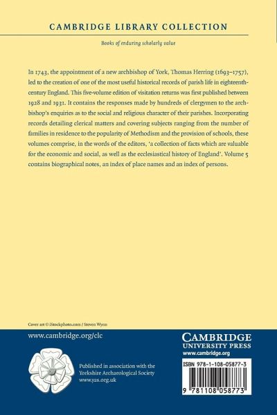 In 1743, the appointment of a new archbishop of York, Thomas Herring (1693-1757), led to the creation of one of the most useful historical records of parish life in eighteenth-century England. This five-volume edition of visitation returns was first published between 1928 and 1931. It contains the responses made by hundreds of clergymen to the archbishop's enquiries as to the social and religious character of their parishes. Incorporating records detailing clerical matters and covering subjects ranging from the number of families in residence to the popularity of Methodism and the provision of schools, these volumes comprise, in the words of the editors, 'a collection of facts which are valuable for the economic and social, as well as the ecclesiastical history of England'. Volume 5 contains biographical notes, an index of place names and an index of persons.