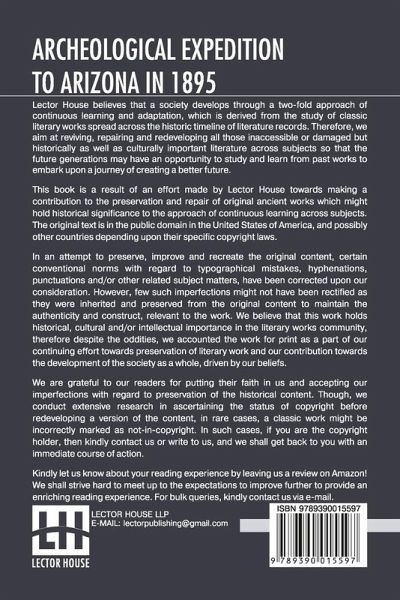 Archeological Expedition To Arizona In 1895 This book is a result of an effort made by us towards making a contribution to the preservation and repair of original classic literature. In an attempt to preserve, improve and recreate the original content, we have worked towards: 1. Type-setting & Reformatting: The complete work has been re-designed via professional layout, formatting and type-setting tools to re-create the same edition with rich typography, graphics, high quality images, and table elements, giving our readers the feel of holding a 'fresh and newly' reprinted and/or revised edition, as opposed to other scanned & printed (Optical Character Recognition - OCR) reproductions. 2. Correction of imperfections: As the work was re-created from the scratch, therefore, it was vetted to rectify certain conventional norms with regard to typographical mistakes, hyphenations, punctuations, blurred images, missing content/pages, and/or other related subject matters, upon our consideration. Every attempt was made to rectify the imperfections related to omitted constructs in the original edition via other references. However, a few of such imperfections which could not be rectified due to intentional\unintentional omission of content in the original edition, were inherited and preserved from the original work to maintain the authenticity and construct, relevant to the work. We believe that this work holds historical, cultural and/or intellectual importance in the literary works community, therefore despite the oddities, we accounted the work for print as a part of our continuing effort towards preservation of literary work and our contribution towards the development of the society as a whole, driven by our beliefs. We are grateful to our readers for putting their faith in us and accepting our imperfections with regard to preservation of the historical content. HAPPY READING!