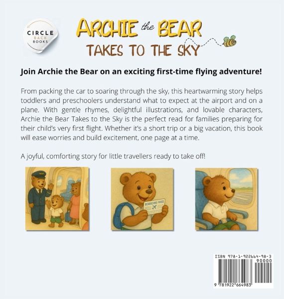 Archie the Bear is off on an adventure - his very first airplane ride! Join Archie the Bear on an exciting first-time flying adventure! From packing the car to soaring through the sky, this heartwarming story helps toddlers and preschoolers understand what to expect at the airport and on a plane. With gentle rhymes, delightful illustrations, and lovable characters, Archie the Bear Takes to the Sky is the perfect read for families preparing for their child's very first flight. Whether it's a short trip or a big vacation, this book will ease worries and build excitement, one page at a time. 8.5 x 8.5 inch Paperback & Hardback available Color Illustrations throughout 40 Pages A joyful, comforting story for little travellers ready to take off!