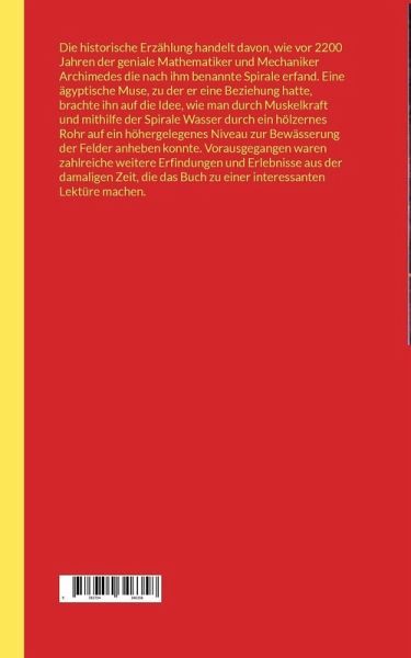 Die historische Erzählung handelt davon, wie vor 2200 Jahren der geniale Mathematiker und Mechaniker Archimedes die nach ihm benannte Spirale erfand. Eine ägyptische Muse, zu der er eine Beziehung hatte, brachte ihn auf die Idee, wie man durch Muskelkraft und mithilfe der Spirale Wasser durch ein hölzernes Rohr auf ein höhergelegenes Niveau zur Bewässerung der Felder anheben konnte. Vorausgegangen waren zahlreiche weitere Erfindungen und Erlebnisse aus der damaligen Zeit, die das Buch zu einer interessanten Lektüre machen.