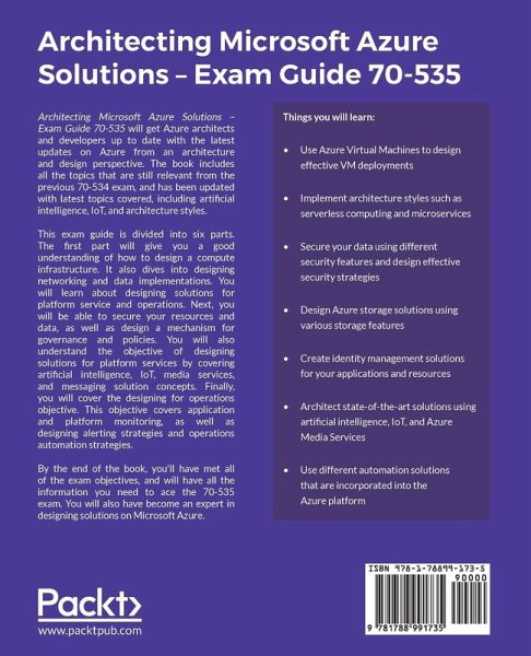 Get certified as an Azure architect by acing the 70-535 Architecting Microsoft Solutions (70-535) exam using this comprehensive guide with full coverage of the exam objectives Key Features:Learn to successfully design and architect powerful solutions on the Azure Cloud platform Enhance your skills with mock tests and practice questions A detailed certification guide that will help you ace the 70-535 exam with confidence Book Description: Architecting Microsoft Azure Solutions: Exam Guide 70-535 will get Azure architects and developers up-to-date with the latest updates on Azure from an architecture and design perspective. The book includes all the topics that are still relevant from the previous 70-534 exam, and is updated with latest topics covered, including Artificial Intelligence, IoT, and architecture styles. This exam guide is divided into six parts, where the first part will give you a good understanding of how to design a compute infrastructure. It also dives into designing networking and data implementations. You will learn about designing solutions for Platform Service and operations. Next, you will be able to secure your resources and data, as well as design a mechanism for governance and policies. You will also understand the objective of designing solutions for Platform Services, by covering Artificial Intelligence, IoT, media services, and messaging solution concepts. Finally, you will cover the designing for operations objective. This objective covers application and platform monitoring, as well as designing alerting strategies and operations automation strategies. By the end of the book, you'll have met all of the exam objectives, and will have all the information you need to ace the 70-535 exam. You will also have become an expert in designing solutions on Microsoft Azure. What You Will Learn:Use Azure Virtual Machines to design effective VM deployments Implement architecture styles, like serverless computing and microservices Secure your data using different security features and design effective security strategies Design Azure storage solutions using various storage features Create identity management solutions for your applications and resources Architect state-of-the-art solutions using Artificial Intelligence, IoT, and Azure Media Services Use different automation solutions that are incorporated in the Azure platform Who this book is for: This book is for architects and experienced developers, who are gearing up for the 70-535 exam. Technical architects interested in learning more about designing Cloud solutions will also find this book useful.