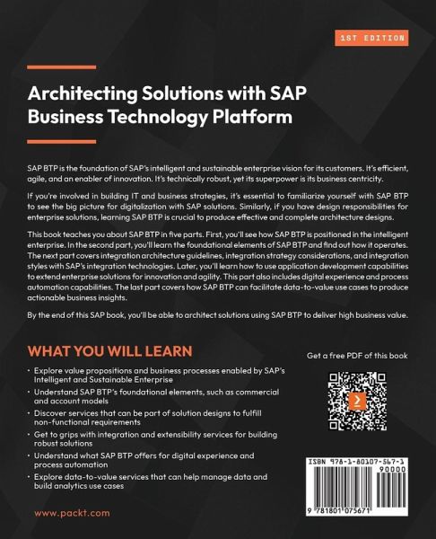 "SAP BTP is the foundation of SAP's intelligent and sustainable enterprise vision for its customers. It's efficient, agile, and an enabler of innovation. It's technically robust, yet its superpower is its business centricity. If you're involved in building IT and business strategies, it's essential to familiarize yourself with SAP BTP to see the big picture for digitalization with SAP solutions. Similarly, if you have design responsibilities for enterprise solutions, learning SAP BTP is crucial to produce effective and complete architecture designs"--
