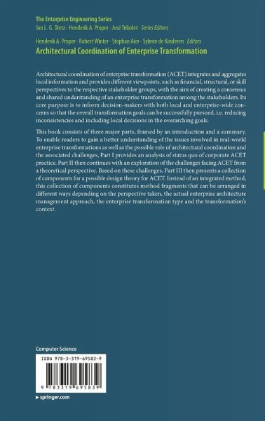 Architectural coordination of enterprise transformation (ACET) integrates and aggregates local information and provides different viewpoints, such as financial, structural, or skill perspectives to the respective stakeholder groups, with the aim of creating a consensus and shared understanding of an enterprise transformation among the stakeholders. Its core purpose is to inform decision-makers with both local and enterprise-wide concerns so that the overall transformation goals can be successfully pursued, i.e. reducing inconsistencies and including local decisions in the overarching goals. This book consists of three major parts, framed by an introduction and a summary. To enable readers to gain a better understanding of the issues involved in real-world enterprise transformations as well as the possible role of architectural coordination and the associated challenges, Part I provides an analysis of status quo of corporate ACET practice. Part II then continues with an exploration of the challenges facing ACET from a theoretical perspective. Based on these challenges, Part III then presents a collection of components for a possible design theory for ACET. Instead of an integrated method, this collection of components constitutes method fragments that can be arranged in different ways depending on the perspective taken, the actual enterprise architecture management approach, the enterprise transformation type and the transformation's context.
