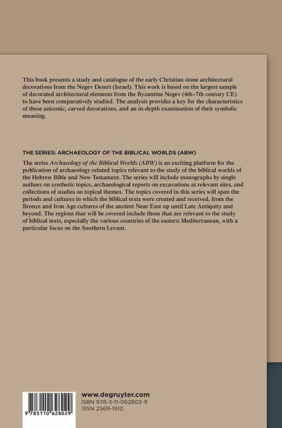 This book presents a study and catalogue of the early Christian stone architectural decorations from the Negev Desert (Israel). This work is based on the largest sample of decorated architectural elements from the Byzantine Negev (4th-7th century CE) to have been comparatively studied. The analysis provides a key for the characteristics of these aniconic, carved decorations, and an in-depth examination of their symbolic meaning.