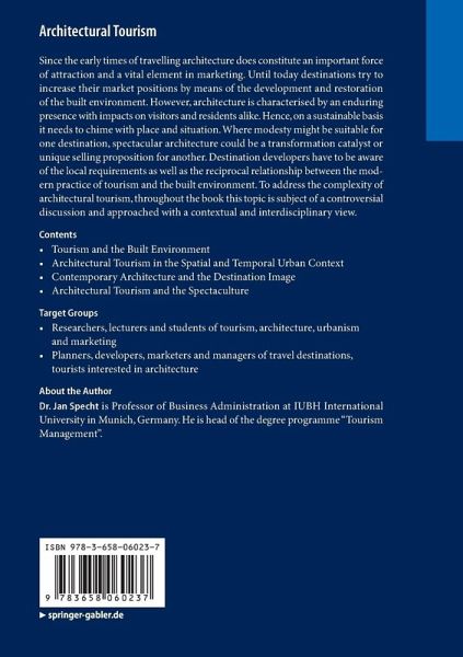 Since the early times of travelling architecture does constitute an important force of attraction and a vital element in marketing. Until today destinations try to increase their market positions by means of the development and restoration of the built environment. However, architecture is characterised by an enduring presence with impacts on visitors and residents alike. Hence, on a sustainable basis it needs to chime with place and situation. Where modesty might be suitable for one destination, spectacular architecture could be a transformation catalyst or unique selling proposition for another. Destination developers have to be aware of the local requirements as well as the reciprocal relationship between the modern practice of tourism and the built environment. To address the complexity of architectural tourism, throughout the book this topic is subject of a controversial discussion and approached with a contextual and interdisciplinary view.