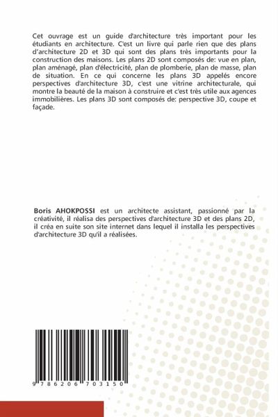 Cet ouvrage est un guide d'architecture très important pour les étudiants en architecture. C'est un livre qui parle rien que des plans d'architecture 2D et 3D qui sont des plans très importants pour la construction des maisons. Les plans 2D sont composés de: vue en plan, plan aménagé, plan d'électricité, plan de plomberie, plan de masse, plan de situation. En ce qui concerne les plans 3D appelés encore perspectives d'architecture 3D, c'est une vitrine architecturale, qui montre la beauté de la maison à construire et c'est très utile aux agences immobilières. Les plans 3D sont composés de: perspective 3D, coupe et façade.