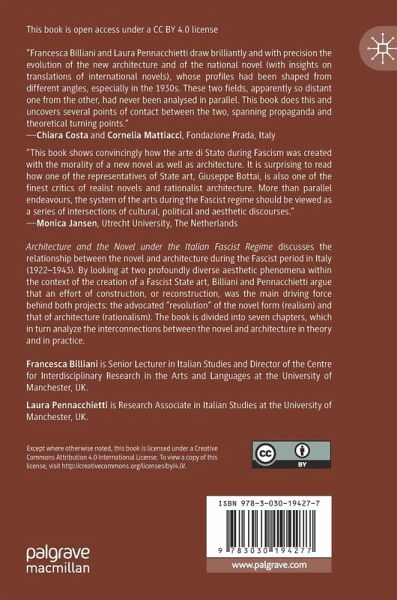 Architecture and the Novel under the Italian Fascist Regime discusses the relationship between the novel and architecture during the Fascist period in Italy (1922-1943). By looking at two profoundly diverse aesthetic phenomena within the context of the creation of a Fascist State art, Billiani and Pennacchietti argue that an effort of construction, or reconstruction, was the main driving force behind both projects: the advocated "revolution" of the novel form (realism) and that of architecture (rationalism). The book is divided into seven chapters, which in turn analyze the interconnections between the novel and architecture in theory and in practice. The first six chapters cover debates on State art, on the novel and on architecture, as well as their historical development and their unfolding in key journals of the period. The last chapter offers a detailed analysis of some important novels and buildings, which have in practice realized some of the key principles articulatedin the theoretical disputes.