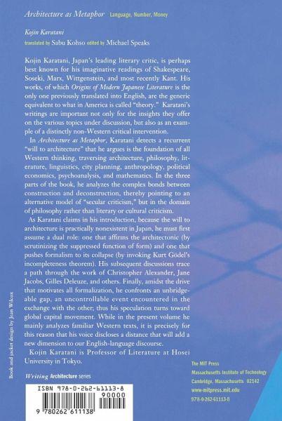 In Architecture as Metaphor, Kojin Karatani detects a recurrent "will to architecture" that he argues is the foundation of all Western thinking, traversing architecture, philosophy, literature, linguistics, city planning, anthropology, political economics, psychoanalysis, and mathematics. Kojin Karatani, Japan's leading literary critic, is perhaps best known for his imaginative readings of Shakespeare, Soseki, Marx, Wittgenstein, and most recently Kant. His works, of which Origins of Modern Japanese Literature is the only one previously translated into English, are the generic equivalent to what in America is called "theory." Karatani's writings are important not only for the insights they offer on the various topics under discussion, but also as an example of a distinctly non-Western critical intervention. In Architecture as Metaphor, Karatani detects a recurrent "will to architecture" that he argues is the foundation of all Western thinking, traversing architecture, philosophy, literature, linguistics, city planning, anthropology, political economics, psychoanalysis, and mathematics. In the three parts of the book, he analyzes the complex bonds between construction and deconstruction, thereby pointing to an alternative model of "secular criticism," but in the domain of philosophy rather than literary or cultural criticism. As Karatani claims in his introduction, because the will to architecture is practically nonoexistent in Japan, he must first assume a dual role: one that affirms the architectonic (by scrutinizing the suppressed function of form) and one that pushes formalism to its collapse (by invoking Kurt Godel's incompleteness theorem). His subsequent discussions trace a path through the work of Christopher Alexander, Jane Jacobs, Gilles Deleuze, and others. Finally, amidst the drive that motivates all formalization, he confronts an unbridgeable gap, an uncontrollable event encountered in the exchange with the other; thus his speculation turns toward global capital movement. While in the present volume he mainly analyzes familiar Western texts, it is precisely for this reason that his voice discloses a distance that will add a new dimension to our English-language discourse.
