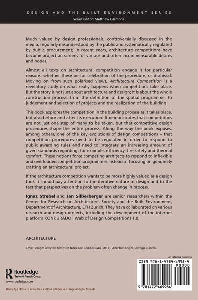 Introduction: unpacking architectural competitions - project design and the building process (Ignaz Strebel and Jan Silberberger); PART I - MANAGING THE PROCEDURE; 1. Two geographical logics in architectural competitions (Ignaz Strebel and Jan Silberberger); 2. The competition between creativity and legitimacy (Kristian Kreiner); 3. The best of both worlds? Client decision making in architect selection processes (Leentje Volker); 4. Design in conversation (An interview with Malcolm Reading); PART II - INSIDE THE COMPETITION; 5. The progressive differentiation of judgement criteria (Jan Silberberger and Ignaz Strebel); 6. Jury board at work: evaluation of architecture and process (Peter Holm Jacobsen and Andreas Kamstrup); 7. Jury boards as 'risk managers': analysing jury deliberations within architectural competitions against the background of risk management (Camille Crossman); 8. Competitions beyond spatial specifications (An interview with Dietmar Eberle); PART III - MAKING THE BUILT ENVIRONMENT; 9. The obligatory passage point (Jan Silberberger and Ignaz Strebel); 10. Architecture as process: OJEU tender and procurement without design (Torsten Schmiedeknecht); 11. Advanced structural engineering (An interview with Werner Sobek)