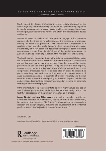 This book explores the competition in the building process as it takes place, but also before and after its execution. It demonstrates that competitions are not just one step of many to be taken, but that competitive design procedures shape the entire process. Along the way the book exposes, among others, one of the key evolutions of design competitions - that competition procedures need to be regulated in order to respond to public awarding rules and need to integrate an increasing amount of given standards regarding, for example, efficiency, fire safety and thermal comfort. These notions force competing architects to respond to inflexible and overloaded competition programmes instead of focusing on genuinely crafting an architectural project.
