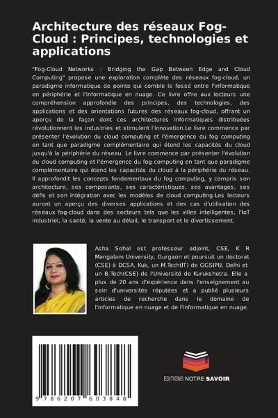 "Fog-Cloud Networks : Bridging the Gap Between Edge and Cloud Computing" propose une exploration complète des réseaux fog-cloud, un paradigme informatique de pointe qui comble le fossé entre l'informatique en périphérie et l'informatique en nuage. Ce livre offre aux lecteurs une compréhension approfondie des principes, des technologies, des applications et des orientations futures des réseaux fog-cloud, offrant un aperçu de la façon dont ces architectures informatiques distribuées révolutionnent les industries et stimulent l'innovation.Le livre commence par présenter l'évolution du cloud computing et l'émergence du fog computing en tant que paradigme complémentaire qui étend les capacités du cloud jusqu'à la périphérie du réseau. Le livre commence par présenter l'évolution du cloud computing et l'émergence du fog computing en tant que paradigme complémentaire qui étend les capacités du cloud à la périphérie du réseau. Il approfondit les concepts fondamentaux du fog computing, y compris son architecture, ses composants, ses caractéristiques, ses avantages, ses défis et son intégration avec les modèles de cloud computing.Les lecteurs auront un aperçu des diverses applications et des cas d'utilisation des réseaux fog-cloud dans des secteurs tels que les villes intelligentes, l'IoT industriel, la santé, la vente au détail, le transport et le divertissement.