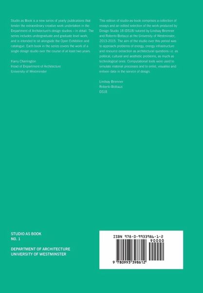 This book is a collection of essays and an edited selection of the work produced by Design Studio 18 (DS18) tutored by Lindsay Bremner and Roberto Bottazzi in the Department of Architecture at the University of Westminster, 2013-2015. The aim of the studio over this period was to approach problems of energy, energy infrastructure and resource extraction as architectural questions i.e. as political, cultural and aesthetic problems, as much as technological ones. Computational tools were used to simulate material processes and to enlist, visualise and enliven data in the service of design.