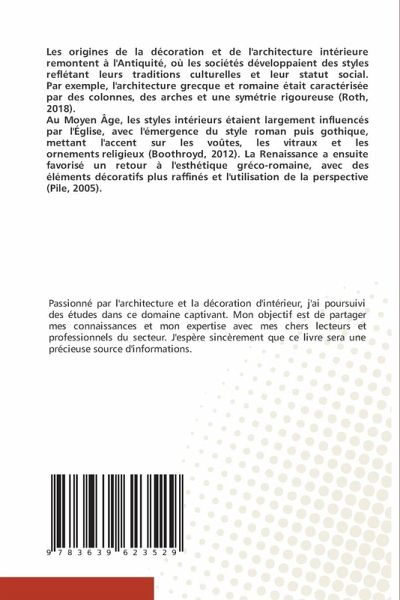 Les origines de la décoration et de l'architecture intérieure remontent à l'Antiquité, où les sociétés développaient des styles reflétant leurs traditions culturelles et leur statut social. Par exemple, l'architecture grecque et romaine était caractérisée par des colonnes, des arches et une symétrie rigoureuse (Roth, 2018).Au Moyen Âge, les styles intérieurs étaient largement influencés par l'Église, avec l'émergence du style roman puis gothique, mettant l'accent sur les voûtes, les vitraux et les ornements religieux (Boothroyd, 2012). La Renaissance a ensuite favorisé un retour à l'esthétique gréco-romaine, avec des éléments décoratifs plus raffinés et l'utilisation de la perspective (Pile, 2005).