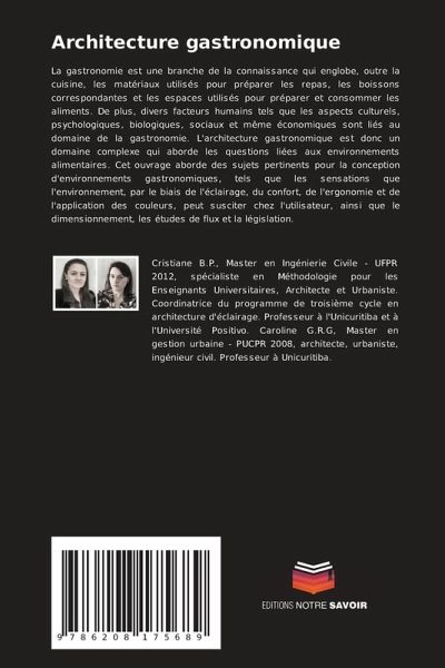 La gastronomie est une branche de la connaissance qui englobe, outre la cuisine, les matériaux utilisés pour préparer les repas, les boissons correspondantes et les espaces utilisés pour préparer et consommer les aliments. De plus, divers facteurs humains tels que les aspects culturels, psychologiques, biologiques, sociaux et même économiques sont liés au domaine de la gastronomie. L'architecture gastronomique est donc un domaine complexe qui aborde les questions liées aux environnements alimentaires. Cet ouvrage aborde des sujets pertinents pour la conception d'environnements gastronomiques, tels que les sensations que l'environnement, par le biais de l'éclairage, du confort, de l'ergonomie et de l'application des couleurs, peut susciter chez l'utilisateur, ainsi que le dimensionnement, les études de flux et la législation.