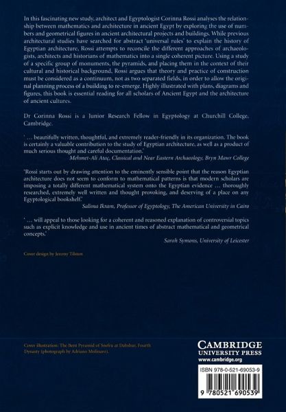In this fascinating study, architect and Egyptologist Corinna Rossi analyses the relationship between mathematics and architecture in ancient Egypt by exploring the use of numbers and geometrical figures in ancient architectural projects and buildings. While previous architectural studies have searched for abstract 'universal rules' to explain the history of Egyptian architecture, Rossi attempts to reconcile the different approaches of archaeologists, architects and historians of mathematics into a single coherent picture. Using a study of a specific group of monuments, the pyramids, and placing them in the context of their cultural and historical background, Rossi argues that theory and practice of construction must be considered as a continuum, not as two separated fields, in order to allow the original planning process of a building to re-emerge. Highly illustrated with plans, diagrams and figures, this book is essential reading for all scholars of Ancient Egypt and the architecture of ancient cultures.