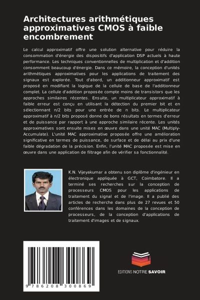 Le calcul approximatif offre une solution alternative pour réduire la consommation d'énergie des dispositifs d'application DSP actuels à haute performance. Les techniques conventionnelles de multiplication et d'addition consomment beaucoup d'énergie. Dans ce mémoire, la conception d'unités arithmétiques approximatives pour les applications de traitement des signaux est explorée. Tout d'abord, un additionneur approximatif est proposé en modifiant la logique de la cellule de base de l'additionneur complet. La cellule d'addition proposée compte moins de transistors que les approches similaires récentes. Ensuite, un multiplicateur approximatif à faible erreur est conçu en utilisant la détection du premier bit et en sélectionnant n/2 bits pour une entrée de n bits. Le multiplicateur approximatif à n/2 bits proposé donne de bons résultats en termes d'erreur et de puissance par rapport à une approche similaire récente. Les unités approximatives sont ensuite mises en oeuvre dans une unité MAC (Multiply-Accumulate). L'unité MAC approximative proposée offre une amélioration significative en termes de puissance, de surface et de délai au prix d'une faible dégradation de la précision. Enfin, l'unité MAC proposée est mise en oeuvre dans une application de filtrage afin de vérifier sa fonctionnalité.