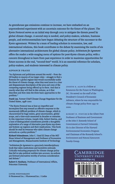 With increasing greenhouse gas emissions, we are embarked on an unprecedented experiment with an uncertain outcome for the future of the planet. The Kyoto Protocol serves as an initial step through 2012 to mitigate the threats posed by global climate change. A second step is needed, and policy-makers, scholars, business people, and environmentalists have begun debating the structure of the successor to the Kyoto agreement. Written by a team of leading scholars in economics, law, and international relations, this book contributes to this debate by examining the merits of six alternative international architectures for global climate policy. Architectures for Agreement offers the reader a uniquely wide-ranging menu of options for post-Kyoto climate policy, with a concern throughout to learn from past experience in order to maximize opportunities for future success in the real, 'second-best' world. It will be an essential reference for scholars, policy-makers, and students interested in climate policy.