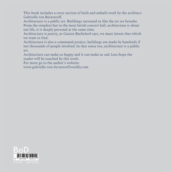 This book includes a cross section of built and unbuilt work by the architect Gabrielle von Bernstorff.Architecture is a public art. Buildings surround us like the air we breathe. From the simplest hut to the most lavish concert hall, architecture is about our life, it is deeply personal at the same time.Architecture is poetry, as Gaston Bachelard says, we must invent that which we want to find.Architecture is also a communal project, buildings are made by hundreds if not thousands of people involved. In that sense too, architecture is a public art.Architecture can make us happy and it can make us sad. Lets hope the reader will be touched by this work.For more go to the author's website:www.gabrielle-von-bernstorff.weebly.com
