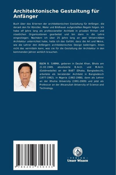 Buch über das Erlernen der architektonischen Gestaltung für Anfänger, die derzeit den für Künstler, Maler und Bildhauer aufgestellten Regeln folgen. Ich habe elf Jahre lang als professioneller Architekt in privaten Firmen und staatlichen Organisationen gearbeitet und bin dann in die Lehre eingestiegen. Nachdem ich über 25 Jahre lang an zwei Universitäten Architektur unterrichtet habe, hatte ich das Gefühl, dass die Art und Weise, wie die Lehrer den Anfängern architektonisches Design beibringen, ihnen nicht das vermitteln kann, was sie für die Gestaltung der Architektur in den kommenden Jahren wirklich brauchen.