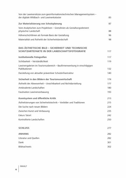 Der Einsatz von Schutzmaßnahmen vor Naturgefahren ist zentraler Aspekt der alpinen Kultur. Dabei verwundert es, dass die Diskussion darüber fachintern geführt wird, in der Öffentlichkeit jedoch kaum wahrzunehmen ist. Die Zusammenschau von Schutzarchitekturen, dem imaginierten Bild der Alpen und dem langsamen Prozess der Adaptierung der öffentlichen Bildwelten an den Zustand der Verbauungen, führt nun zusammen was bis dato getrennt betrachtet wird. Nämlich, dass die touristisch konsumierten Landschaften mit einem nicht unerheblichen Aufwand erst stabilisiert werden müssen. Das Buch zeigt auf, wie die Produktion von Sicherheitsräumen im Spannungsfeld von Ästhetik und Technik wirksam wird und bietet Perspektiven auf Landschaft, die über die vermeintliche Unberührtheit von Natur hinausführen.