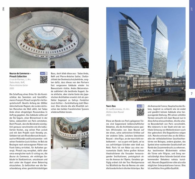 Der "Architekturführer Paris" zeigt mehr als 250 Bauten, die seit 1898 zwischen Zentrum und Banlieue entstanden sind. Abseits von ausgetretenen Pfaden lädt diese Auswahl zur Neubewertung von Bauwerken ein, die bisweilen zu Unrecht in Vergessenheit geraten sind. Paris ist nicht nur eine internationale Metropole mit zwölf Millionen Einwohnern, sondern dient auch als städtebauliches Eroberungsgebiet und architektonisches Versuchsfeld. Jean-Philippe Hugron führt die Leser kenntnisreich an bekannte und überraschende Orte der französischen Hauptstadt: »Wandeln Sie im Schatten von Ricardo Bofill in Noisy-le-Grand und Dom Bellot in Vanves. Nähern Sie sich den modernen und brutalistischen Ensembles des ersten Umgebungsrings der französischen Hauptstadt. Erleben Sie den Enthusiasmus der Trente Glorieuses und ihrer vertikalen Verrücktheiten oder sogar die ambitionierten Grands Travaux der Ära Mitterands. Begeben Sie sich auf Spurensuche nach den ersten Projekten der einzigen französischen Pritzker-Preisträger, Christian de Portzamparc und Jean Nouvel ...«