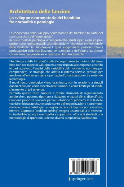 Architettura delle funzioni studia il comportamento motorio del bambino non per tappe di sviluppo, ma come risposta alle esigenze, creando le basi, attraverso l'analisi della variabilità del movimento normale per comprendere le strategie che adotta il Sistema Nervoso Centrale per assolvere all'esigenza stessa e per capire l'organizzazione che sottende la patologia. Il movimento patologico viene esaminato, non in relazione a singoli quadri clinici, ma come vincolo delle funzioni e come limite per il soddisfacimento di tali esigenze. Pertanto questo testo ambisce a fornire strumenti di ragionamento ampio, che si possono riportare a situazioni e quadri clinici diversificati. Contiene proposte concrete per la risoluzione di problemi al di là delle tecniche fisioterapiche, tenendo conto dell'organizzazione neuromotoria delle diverse patologie. La singola tecnica dà risposte non esaustive, mentre l'approccio "problem-solving" insegna una modalità di intervento trasferibile ad ogni eventualità e soprattutto offre agli studenti una metodologia d'approccio, utile nei diversi campi della riabilitazione.