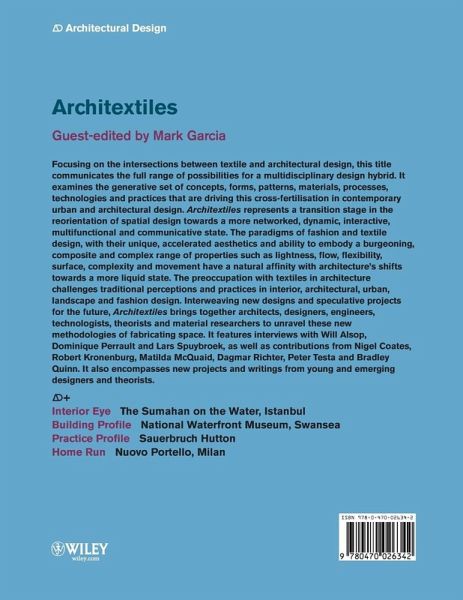 Focusing on the intersections between textile and architectural design, this title communicates the full range of possibilities for a multidisciplinary design hybrid. It examines the generative set of concepts, forms, patterns, materials, processes, technologies and practices that are driving this cross-fertilisation in contemporary urban and architectural design. Architextiles represents a transition stage in the reorientation of spatial design towards a more networked, dynamic, interactive, multifunctional and communicative state. The paradigms of fashion and textile design, with their unique, accelerated aesthetics and ability to embody a burgeoning, composite and complex range of properties such as lightness, flow, flexibility, surface, complexity and movement have a natural affinity with architecture's shifts towards a more liquid state. The preoccupation with textiles in architecture challenges traditional perceptions and practices in interior, architectural, urban, landscape and fashion design. Interweaving new designs and speculative projects for the future, Architextiles brings together architects, designers, engineers, technologists, theorists and material researchers to unravel these new methodologies of fabricating space. It features interviews with Will Alsop, Dominique Perrault and Lars Spuybroek, as well as contributions from Nigel Coates, Robert Kronenburg, Matilda McQuaid, Dagmar Richter, Peter Testa and Bradley Quinn. It also encompasses new projects and writings from young and emerging designers and theorists.