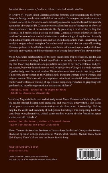 In Archive of Tongues Moon Charania explores feminine dispossession and the brown diaspora through a reflection on the life of her mother. Drawing on her mother's memories and stories of migration, violence, sexuality, queerness, domesticity, and the intimate economies of everyday life, Charania conceptualizes her mother's tongue as an object of theory and an archive of brown intimate life. By presenting a mode of storytelling that is sensual and melancholic, piercing and sharp, Charania recovers otherwise silenced modes of brown mothers' survival, disobedience, and meaning making that are often only lived out in invisible, intimate spaces, and too often disappear into them. In narrating her mother's tongue as both metaphor for and material reservoir of other ways of knowing, Charania gestures to the afflictions, limits, and failures of feminist, queer, and postcolonial scholarly interrogations and the consequences of closing the archive of the brown mother.